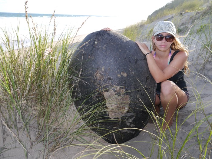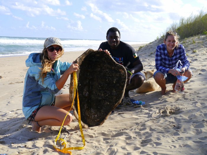 Jess, Gabriel and Lauren with a carapace of a large mature loggerhead sea turtle found in the sand dunes down at Zavora.