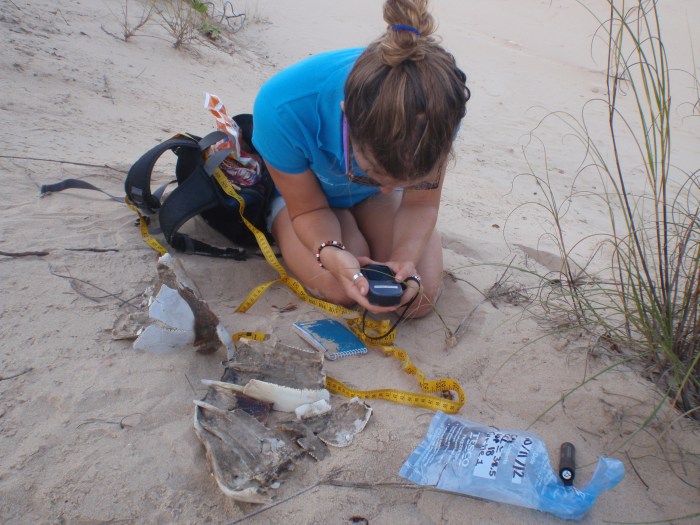 Jess marking a waypoint with the GPS and collecting a genetics sample of the juvenile green sea turtle remains.