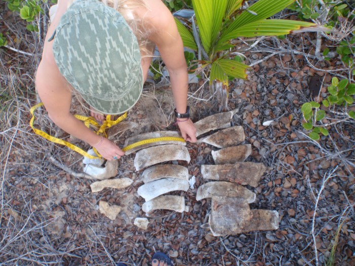 Jess with the remains of a mature sea turtle suspected to be a Loggerhead. The remains were found in a spear fishers campsite along side their wetsuits, fishing gear and old clothes.