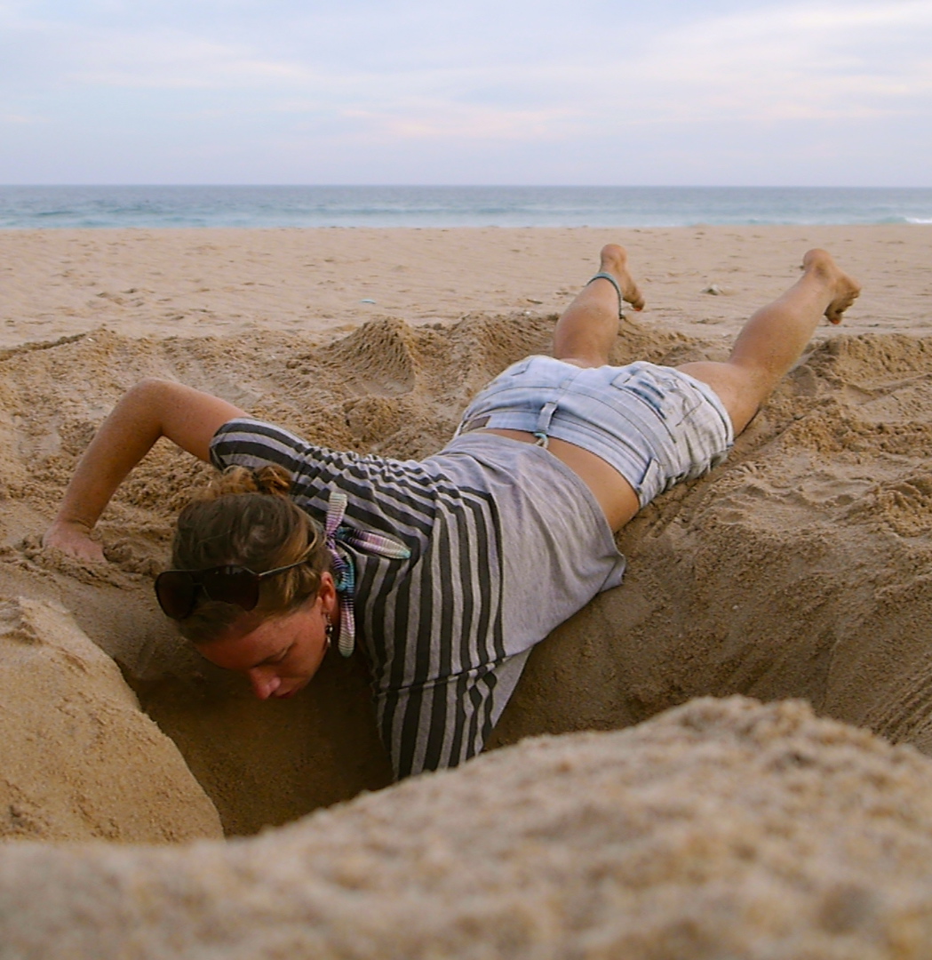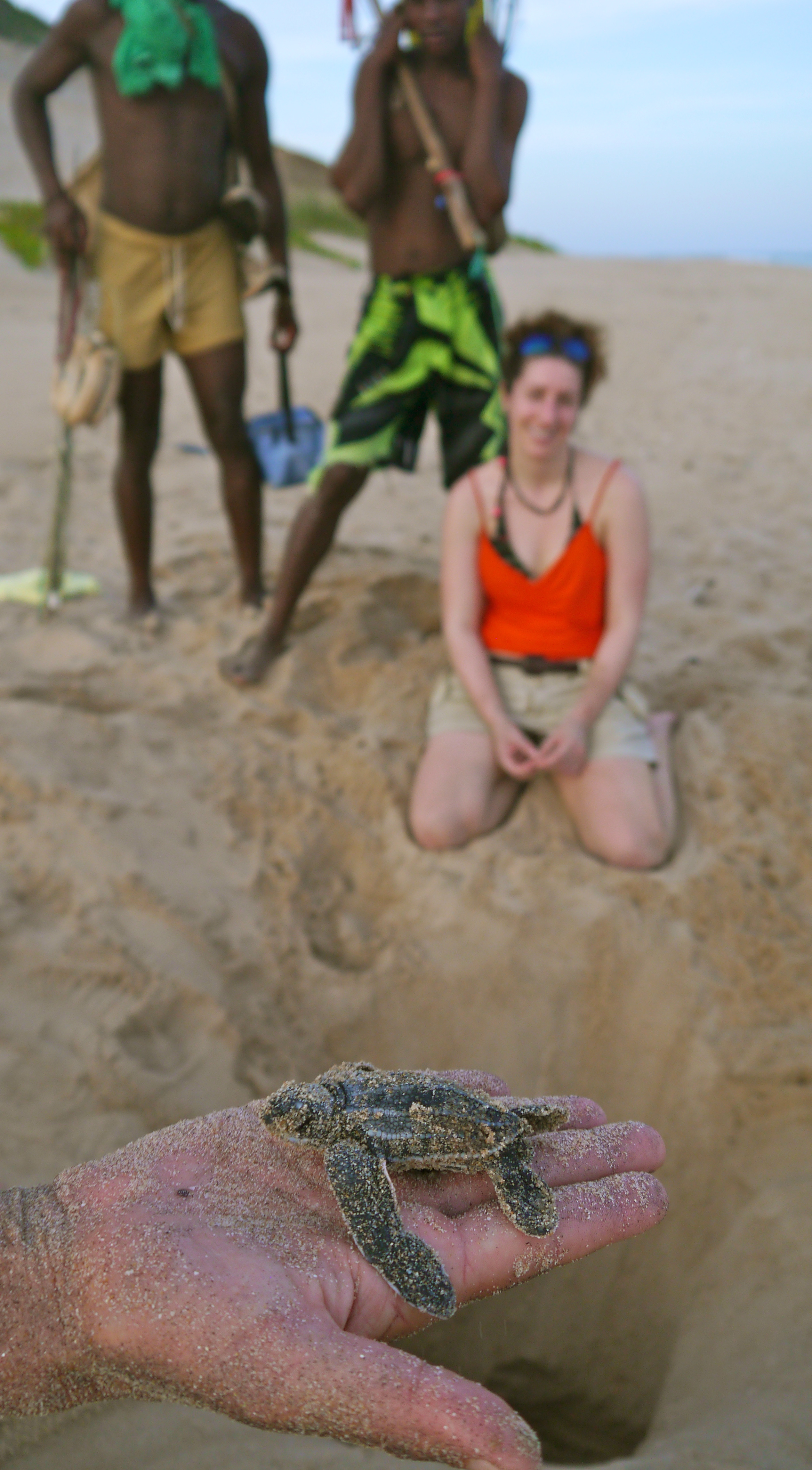 Along come our pari-angos (amigos in local dialect Bitonga) the pescadors just before the sun starts to set. They are intrigued to see what the mzungu’s “white people” are doing digging up half the beach. They crowd around the excavation site, I still have my head in the hole untangling remains of shells and carcasses when a second alive hatchling emerges! The pescadors are excited, they comment that they don’t regularly see the baby turtles. One asks how come there are so many dead hatchlings and I explain to him (in scratchy Portuguese) that the hatchlings and the eggs are very sensitive to temperatures of the beach sand and when the sand is very hot they cannot survive. The pescadors watch for a while, bantering amongst themselves in Chope the local dialect and then resume their walk along the beach.