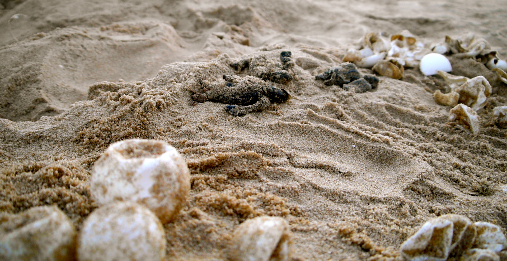 When we reach the nest site, the nest cone is obvious but all the hatchling tracks have been covered over from heavy rainfall the night before. I get settled and then begin to sink my arm into the nest cone, to check the surface sands for any hatchlings that may not have emerged yet. I can’t feel the distinctive notch of the eggtooth or beak of any hatchlings sleeping in the surface sands so we begin to excavate the nest. The sand is soft, loose compared to the surroundings and feels slightly warmer and more humid. After several cave -ins and collapses of our excavation attempt the fist eggshells are detected.