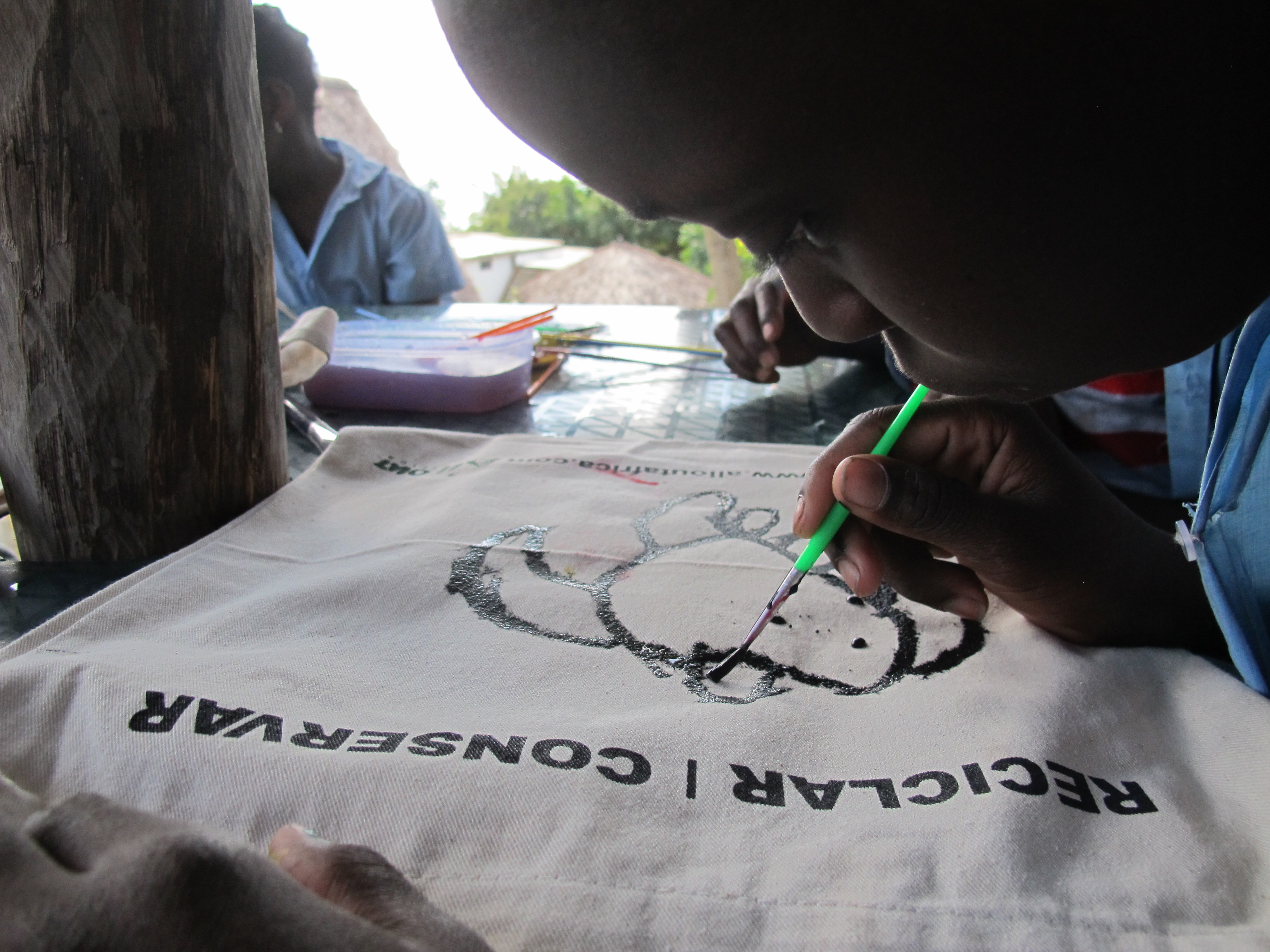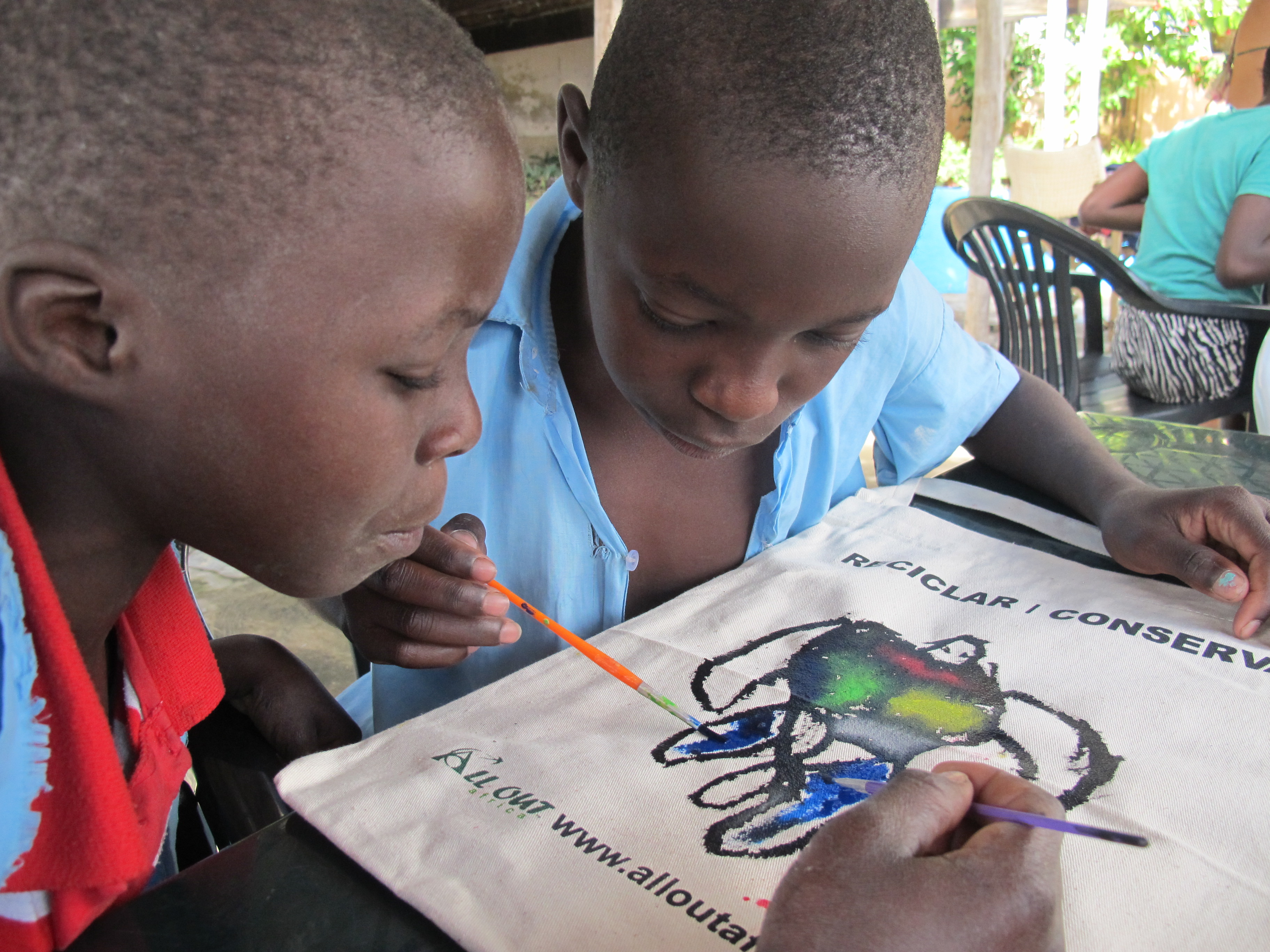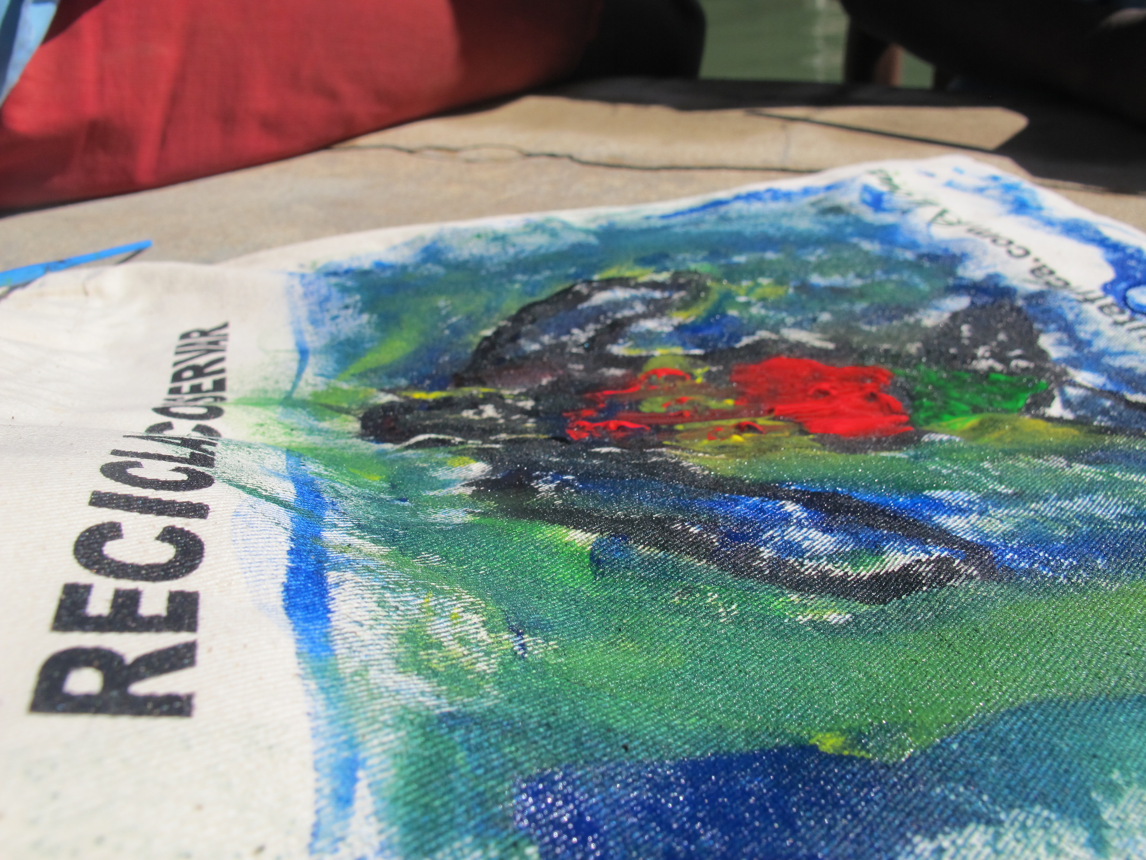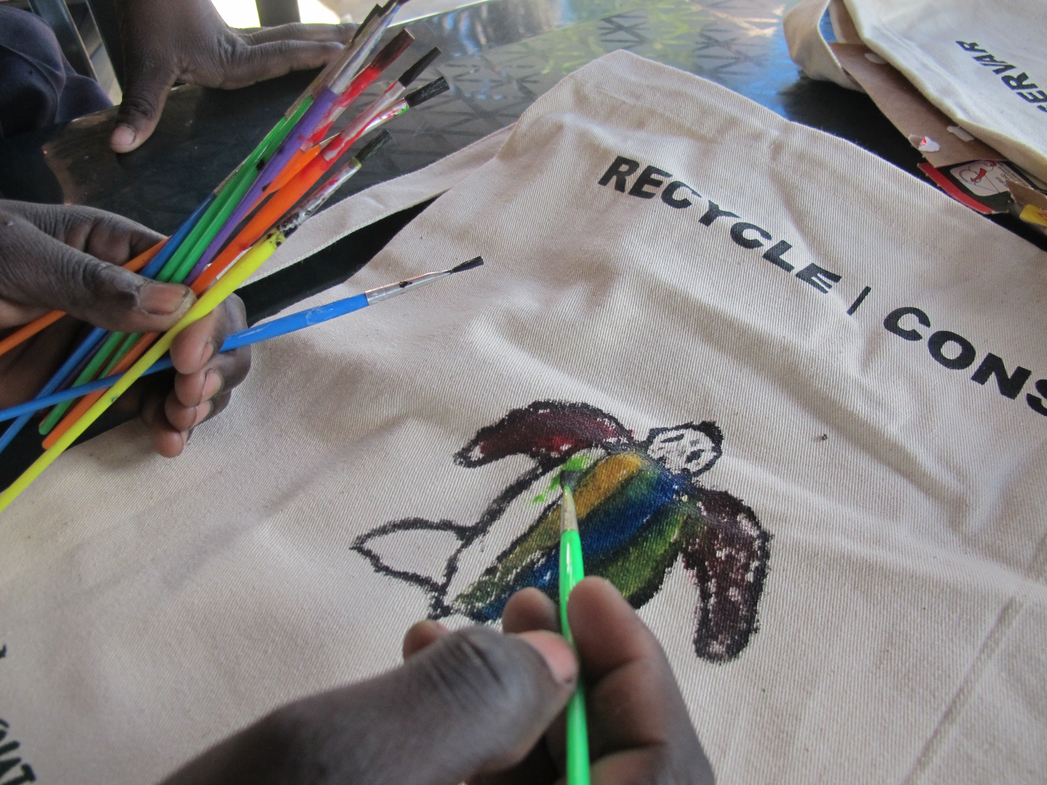 Plain canvas carry bags were created and printed with the simple message, ‘Recycle. Conserve’, where one side of the bag the text is in Portuguese and the other in english. The concept was to get the kids to engage with our topic by participating in an crafty activity. Exploring ideas through art lessons is very effective here, these type of activities are not part of the formal school curriculum so it makes the activity not only new and exciting but memorable.